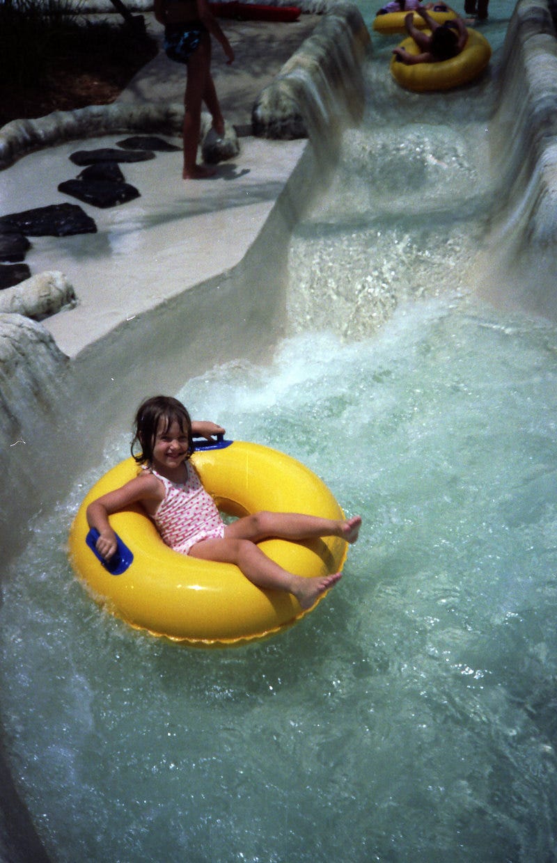 Disney creates a unique story for each park. Typhoon Lagoon’s narrative revolves around a ship stranded by a typhoon on an island, with all the details scattered around the park stemming from that tale. I remember admiring the small touches the Disney Imagineers included, the most notable being a water-spouting, wrecked ship atop a mountain. The water park had just opened in 1989 when we visited. I don’t recall feeling that it appeared sparse in any way.
